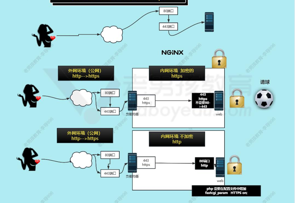 - 用户请求http(80)–跳转–https(443)